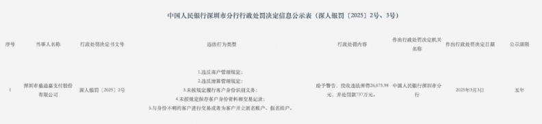 今年3月,人民银行深圳市分行公开的行政处罚信息显示,广东盛迪嘉电子商务股份有限公司(简称“盛迪嘉支付”)因存在“违反商户管理规定”等5项违法行为,遭罚737万元。同时,时任盛迪嘉支付总经理曾某洪被给予警告,并处罚款23.5万元。